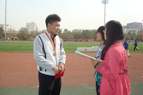 当问及他夺冠后的内心感受时,王昱表示心情很激动。作为一名刚入学不久的大一新生,能够有次机会参与校运会并取得第一名的成绩,是他始料未及的。谈到赛前训练,王昱不好意思地说自己并未充分准备,也没有做过长期系统的训练,因此在比赛过程中反而没有过多的思想压力,只想到要竭尽全力。此外,他还提到赛前的一段小插曲,原想报名参加铁饼比赛,却阴差阳错参加了铅球。但赛场上沉着比赛、镇定自若的表现,也着实让我们惊叹。被问到是否因为有运动天赋才获得如此佳绩,王昱微笑着说中学期间曾进行过铅球训练,并且自己也爱好运动,才得到第一名的成绩。对于即将参加比赛的选手,王昱希望大家要端正心态,切勿紧张,以轻松的姿态面对比赛。