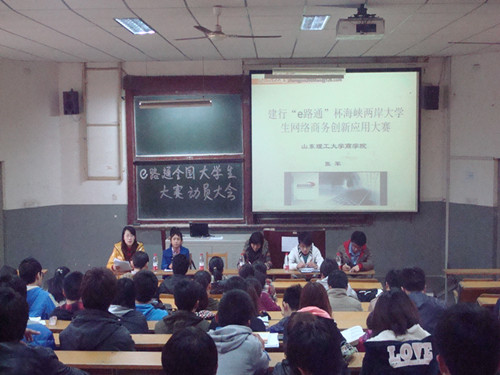 会议伊始,秦伟伟介绍了商公司三年来参加“e路通”比赛所取得的优异成绩,并对此届参赛选手进行了鼓励。随后,张军老师以幻灯片的形式向在场参赛选手讲解了对网络商务创新应用的认识,并向大家提供了参赛的5种基本模式:网络贸易与零售、商务模式创新、金融与支付、网络营销和策划、移动商务,使得在场选手对比赛有了基本了解。随后,张主任强调了大赛中的“创新”和“应用”二词,并与在场选手进行现场提问交流,加深了选手对比赛的认识。最后,去年参赛获奖队伍队长石秀介绍了参赛的有关经验,她说参赛过程充满了困难和挑战,建议选手们以学习的姿态积极参与到比赛中来,重视团队合作力量,争取佳绩。