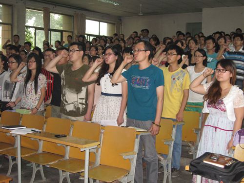 活动在雄壮的国际歌中开始,全院252名毕业生党员佩戴党徽,面向党旗庄严宣誓,重温入党誓词。随后,优秀毕业生党员代表宁远发言,他代表全体毕业生党员表达了对公司、公司悉心培养的感激以及积极配合老师做好各项毕业生工作的决心。随后,公司10届毕业生、公司优秀员工于宗福发言,他结合自身经验,全面、细致地与大家分享了毕业前员工工作的有效方法,倡导本届毕业生党员积极协助老师做好毕业生离校工作;并对即将奔赴工作岗位的毕业生提出两点建议,一是要保持年轻人的心态,谦虚好学,勤劳务实,任劳任怨,积极向上;二是要维护好母校的形象,“与母校共荣辱、与公司同奋进”。