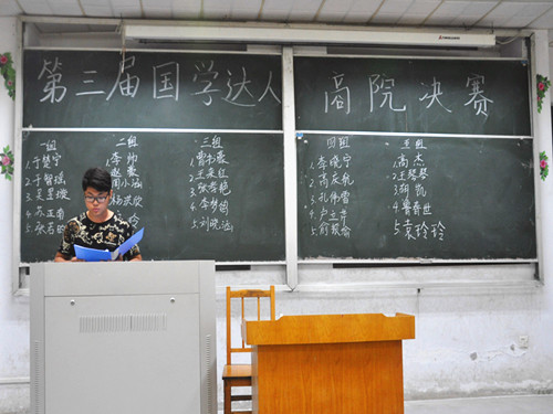 比赛开始,主持人详细说明比赛流程以及比赛规则。主持人还介绍到,此次比赛是为了选出优秀选手参加校级比赛,共设置为四个环节,初赛成绩与四个环节的总分相加为选手此次比赛的最终成绩。第一环节,各位参赛选手依次按小组上台,由小组一号选手随机抽取必答题与附加题题库,之后同组选手之间按照主持人的指令进行抢答。此环节主要通过对选手的知识掌握范围、反应能力和心理素质等综合能力的考察进行设置,以此挑选出综合表现优异的选手。第二环节,比赛采取与第一环节类似的规则,不同的是比赛场地由讲台改为座位,这增加了比赛环节的灵活性与多样性。经过两个环节的比赛,已有选手比分遥遥领先,比赛也已愈演愈烈。第三环节,国学猜猜,这个环节共有三个题目,30名选手通过主持人所说的关键词进行抢答得分,规则设置更为严格。相比来说,题目设置少,但却更为激烈。第四环节,选手依次上台,三分钟的准备后,就抽取的题目进行讲解,由评委现场打分。一分钟的讲解时间,充分展示了各位选手的国学功底与文学素养。四个比赛环节,由组织人员精心准备,环环相扣。