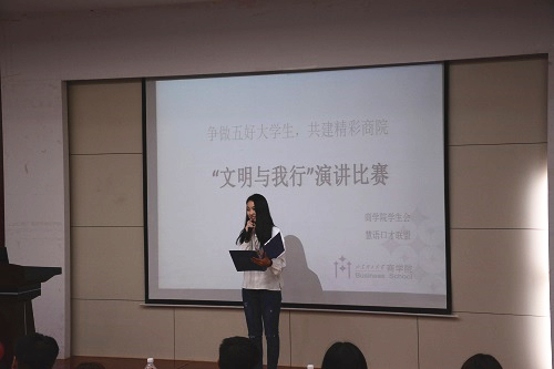 比赛伊始,主持人对比赛的规则和评分标准等作了阐述,从演讲内容、语言表达、形象风度、综合印象四部分做出演讲评分要求,根据参赛选手的演讲情况,评出奖项,优秀者将优先在商公司毕业晚会上被选用。比赛开始之前,校朗读者代表张潇文作开场演说,正式比赛开始,各参赛选手以文明涵养、文明意识、文明传统为视角进行演讲,将文明与民族、道德、自身习惯相联系,向“争做五有老员工,共建美好商院‘文明与我行’”演讲主题靠拢,以背景音乐、ppt作为辅助,选手灵活采用典故、新闻事件、自身经历感受阐述自己的演讲主题,或慷慨激昂,或诙谐幽默,或沉郁悲怆,各显千秋,极尽个人鲜明特点,评委点评简明扼要,给出自己的独到见解,有助于选手积累比赛经验,提高演讲水平。