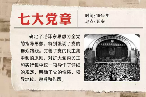 为了争取抗日战争的最后胜利,把中国引向光明的前途,中国共产党于1945年4月23日至6月11日,在延安召开了第七次全国代表大会。“七大”的工作方针是:团结一致,争取胜利。大会总结了中国共产党领导中国民主革命在二十四年中曲折发展的历史经验,特别是总结了八年抗战的经验,制定出打败日本侵略者,建立新中国的正确的纲领和策略;批评了党内的错误思想,系统地阐明党的优良传统和作风,使全党的认识在马克思列宁主义、毛泽东思想的基础上统一起来;选举产生以毛泽东为首的中央领导集体,使全党在组织上达到空前的团结。“七大”是中国共产党在民主革命时期召开的最后的、也是最重要的一次代表大会。它以“团结的大会,胜利的大会”载入中国共产党的史册。