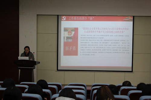 党课培训会上,于国良就十九大基本概述、十九大工作报告体现的四个“新”、十九大报告的十大关键词、十九大报告四十个新提法、新举措进行了详细阐述。首先,她对习近平总书记在十九大上做出的题为《决胜全面建成小康社会夺取新时代中国特色社会主义伟大胜利》的报告进行讲解。紧接着,她讲到,中国现在站在世界社会主义运动的最前沿,在很大程度上决定了世界社会主义的命运,我们有必要、有责任在理论上不断进行探索、总结、深化。