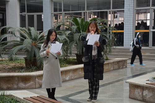 诗朗诵环节于三号教学楼开展,由王炫慈,田庭宁朗诵,面向三号教学楼全体师生。朗诵伊始主持人通过播放一曲音乐,引起师生的情感共鸣。随后,王炫慈与田庭宁深情朗诵《青春中国》,活动现场气氛浓厚,员工们认真聆听,态度认真,当朗诵到高潮部分“今天,一个大写的中国,让人读得光明、读得酣畅。今天,一个腾飞的中国,更让人读得生动、读得自豪”时现场员工不自觉鼓掌,为今日祖国的强大感到骄傲。签名默哀环节于餐厅门口举行,由员工会相关部门负责现场秩序,同学们积极参与活动,态度认真且严肃,于南京大屠杀80周年公祭日为逝者默哀并在条幅签上自己的姓名,留下自己的祝福。