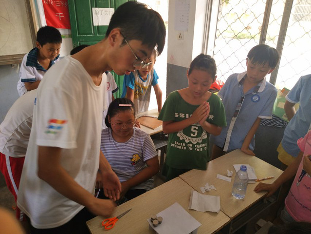 为了培养孩子们的创新精神,下午支教团安排了创新性活动课程。在课堂上,支教队员提出“纸桥承重”的任务,主要是设计不同的纸桥测量能够承受的最大硬币重量,孩子们小组协作完成支教团员的创新任务,不仅培养孩子们的创新精神,更提高了团队意识。