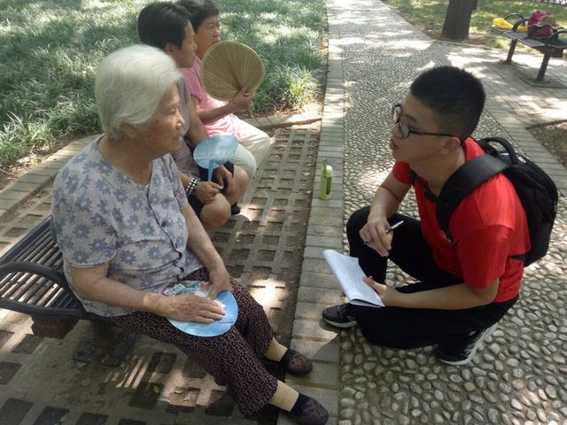 7月24日,“不同养老模式老年人心理状况调研”团队前往人民公园进行调研。针对不同养老模式下老年人的心理状况,团队成员采取随机抽样的方法以访谈的形式对老年人进行询问。老人们在锻炼之余,和青年人一起聊天叙情,调研人员真正走进老人们的心里,为他们排忧解难。