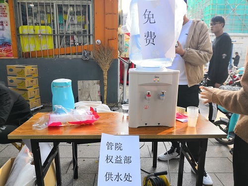 权益部成员提醒同学们多喝热水,并邀请他们坐下休息。