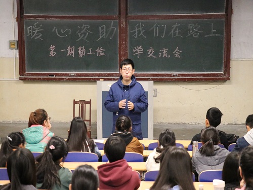 11月15日晚,十大正规买足球网站在四号教学楼104教室开展“暖心资助,我们在路上——第一期勤工助学交流会”活动。此次活动由院辅导员张仕杰主讲,部分员工参加。