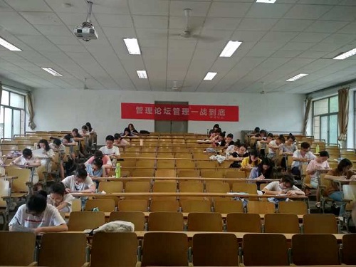 “管理一站到底”活动经过线上或者线下的方式进行报名。活动分为初赛和决赛两部分,以小组合作的形式进行。初赛的形式为笔试,笔试试题由单项选择题、多项选择题、判断题和简答题四部分组成,共计100分。此次考试于6月7号下午两点半正式开始,考试分为两场,第一场时间为2:30到4:00,第二场时间为4:20到5:50,最终根据笔试成绩来决定进入下一轮比赛的人员名单。考试前,首先由监考人员宣读考试注意事项:进入教室前,通过盗梦空间签到码签到。参试人员在工作人员的安排下入座。将校园卡或身份证置于桌面上。将手机交到工作人员处。答题完毕后即可立即交卷离场。