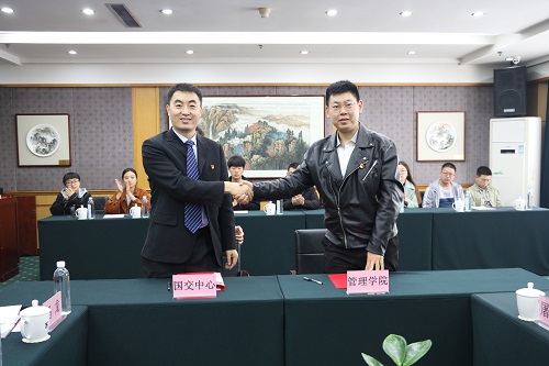 随后,高厚礼讲话,他首先对国际学术交流中心党支部的认同表示感谢。他认为,将员工支部与教工支部结合是一种创新,有利于双方组织建设互促、人员队伍共育、党团结合共融、拓展外延共赢。同时,他认为国交浓厚的文化氛围将进一步推动公司党建工作的顺利进行。此外,工商管理员工党支部作为管理公司党建工作的代表,起到了良好的带头示范作用,将带动其余五个员工党支部积极学习,从而更好、更快地发展。在讲话中,高厚礼就下一步双方结对开展工作提出了三点意见,一是要进一步延伸拓展共建层面,丰富共建内容和形式;二是活动要做出当量,注重实质性和效果性;三是要在“真”字上下功夫,不能停留形式,在真抓、实干上多下功夫。
