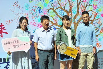 在迎新过程中,公司党委副书记、董事长张铁柱同有关校领导,相关职能部门负责人以及公司党总支书记高厚礼,经理程钧谟、党总支副书记高静静,公司相关领导、部门负责人共同看望公司新生及迎新工作人员,领导们来到各专业报道处详细了解新生报道情况,慰问迎新工作人员。活动中,张铁柱董事长听闻今天刚好是两位新生的生日,便为他们精心准备了有关管理学书籍,并题写祝福语,作为生日礼物赠予两位同学,同时也作为新生入学礼物,表达了对管院新生学子的殷切期望与嘱托。最后,领导们与新生在背景墙前合影留念。