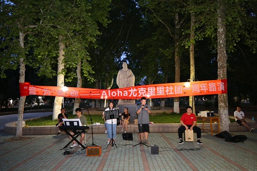 6月15日,Aloha尤克里里社团一周年路演于中心花园举行。参与这次路演的有会长赵梦媛,副会于秋滢、李晓倩、张轶博、邹和菲,社团骨干石大千、信长辉、于志豪、王希辰、张文竹等。