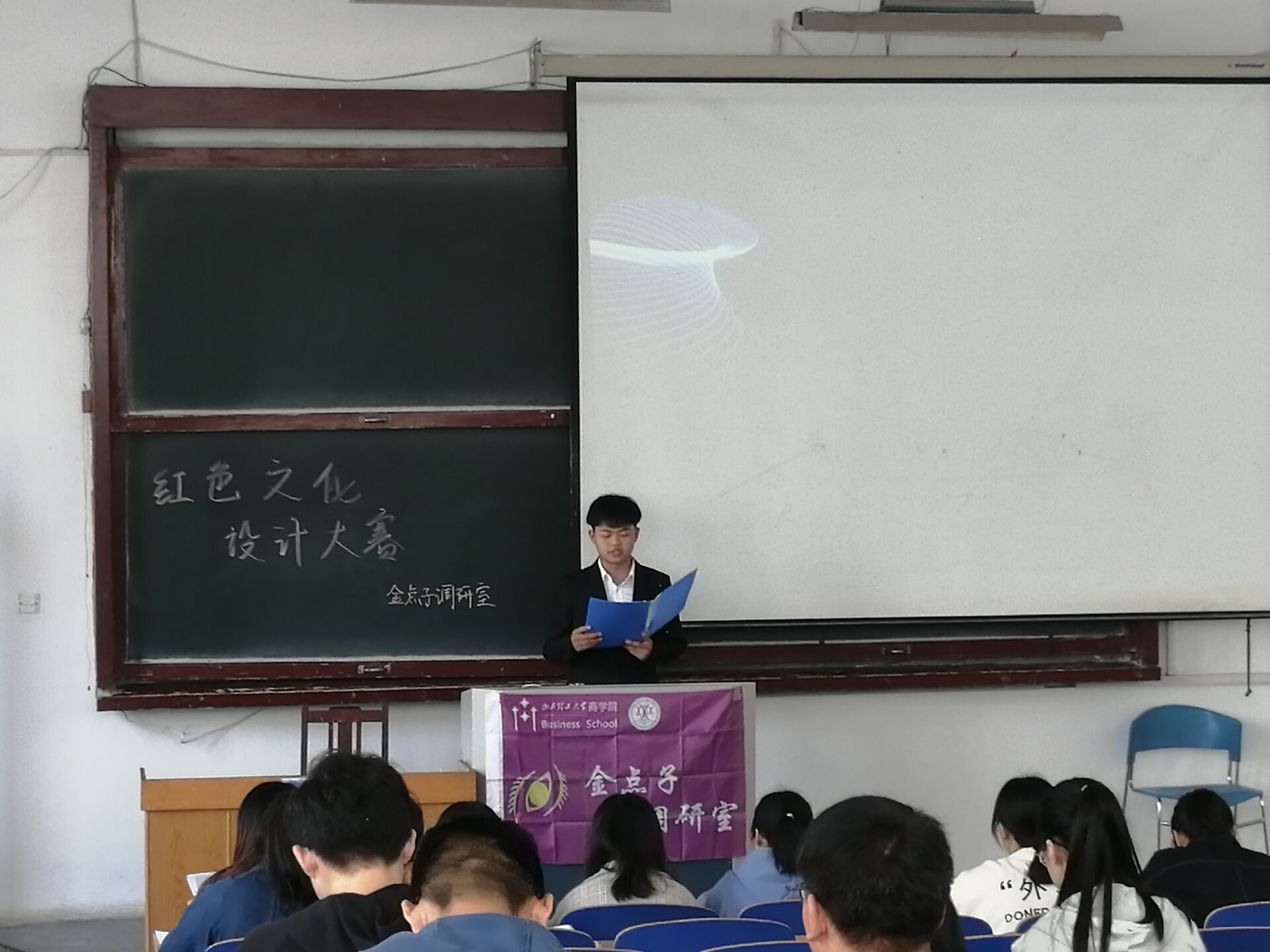 11月1日下午,金点子调研室举办的红色文化设计大赛答辩于四号教学楼103教室举行。此次比赛由金点子调研室会长黄小纯组织策划,社团会员部、策划部、新闻部、秘书处等部门联合组织,副会长秦琰霜、部长陶素格,社团优秀成员李广通、余邦正、张越担任评委。张康豪主持,共有10支队伍参加此次比赛。