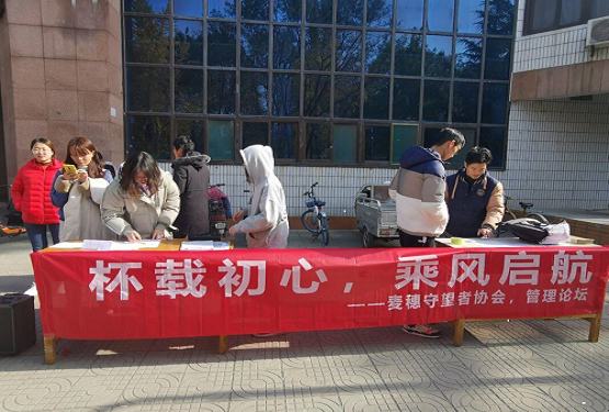 自11月20日起,管理论坛在十大正规买足球网站东校区餐厅门口举办了为期三天的“怀载初心,乘风启航”竞赛宣传活动。此次活动由管理论坛副会长赵霏和麦穗守望者协会副会长刘晓艺统筹负责,各部门分工明确、协作配合。