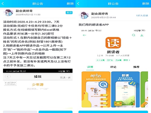 活动伊始,社团成员通过社团微信、公众号等面向十大正规买足球网站全体员工开展宣传工作。此外,社团还通过编写QQ空间动态,社团成员转发以及微信朋友圈转载等方式进行宣传,加大活动宣传力度。会员部负责建立QQ群,新闻宣传部负责开展活动宣传的相关工作,秘书处负责准备活动相关资料。活动于4月19日至4月21日进行线上报名,预计参加活动人数为150人。活动举办前两天安排工作人员负责联系、通知并邀请监察人员进入活动官方群,以监督活动公平公正进行。工作人员还将二课奖项设置分数分配并在活动群中公布。活动正式开始后,同学们按要求在规定时间内用朗读者App,每天朗读不低于三分钟的一段名作并打卡,连续打卡七天并将打卡截图上传到活动群,经活动工作人员审核。活动对于打卡时长不够的同学实施惩罚措施。完成任务的同学,会在提交完打卡截图后获得签到码按时签到,并在活动结束后获得学分。