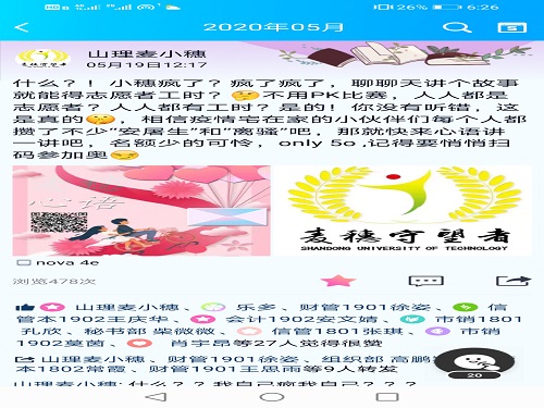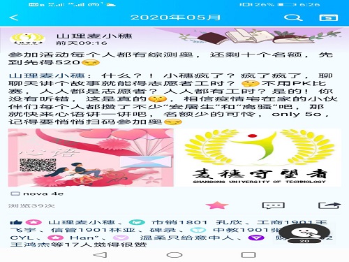 为确保此次活动的进行,麦穗守望者协会宣传人员进行了积极的宣传工作。此次活动采取线上宣传的形式麦,穗守望者协会通过各种社交平台及时进行推广,使得大家了解活动的基本概念、目的和意义。引导大家在了解活动后积极报名、参与到此次活动中来。此次活动的录取采取审核制,到梦空间App仅有50个名额,录取顺序将由报名人员发送消息的时间确定。参与此次活动的同学可以讲述疫情期间发生在自己或者朋友之间的趣事,其他志愿者也可以在分享的故事下面表达自己的观点和感受。