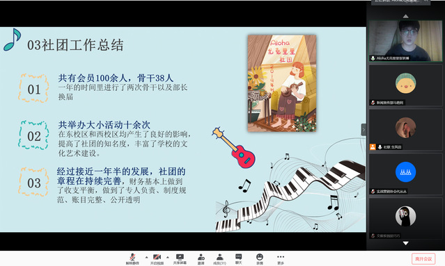 会议伊始,评委以及社团负责人陆续进入会议室。随后,覃晴宣布会议正式开始,此次答辩由事先抽签决定答辩顺序,各社团负责人依次进行答辩。社团答辩主要有三部分内容,第一部分社团简介,介绍社团的口号、宗旨以及品牌活动等;第二部分社团工作总结,此次部分主要是对社团本学期活动举办、活动影响以及下学期对举办活动的想法等方面进行介绍,并对活动的创新点和独特思路做出充分阐释等等;第三部分未来工作计划,由于疫情的影响,很多线下活动无法举办,社团计划本学期将要举办的活动会有部分在下学期举办,同时创新下学期将新的活动。每个社团答辩完成后,评委会对社团进行点评并打分。最后,答辩结束,社团负责依次退出会议。