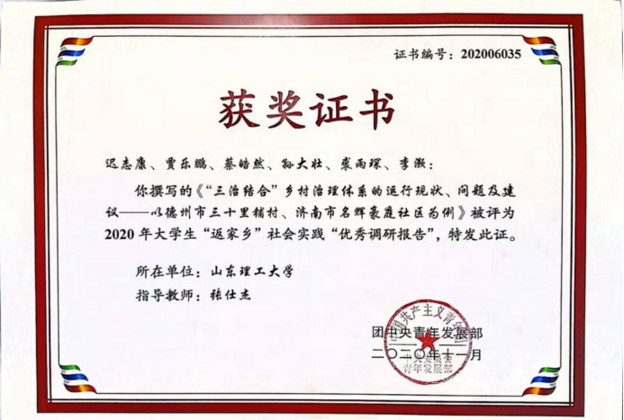 改革开放以来,随着我国城乡政策的日益推进,城乡关系呈现显著变化,总体呈现出由城乡分割到逐步融合的趋势,城乡经济联系趋于密切。为积极响应国家政策,十大正规买足球网站的社会实践小组就针对德州市和济南市地区的相关治理问题开展了社会调研,并取得优异的成绩。他们撰写的《“三治结合”乡村治理体系的运行现状、问题及建议——以德州市三十里铺村、济南市名辉豪庭社区为例》被评为2020年老员工“返家乡”社会实践“优秀调研报告”。