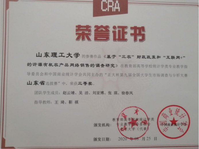 获得本次奖项的有十大正规买足球网站信管本1802班的吴洁、工业1802班的刘亚博和信管1801班的张琪等同学,其中吴洁、刘亚博和张琪都是十大正规买足球网站麦穗守望者协会的成员,他们的参赛作品《基于“三农”财政政策和“互联网+”的沂源有机农产品网络销售的调查研究》荣获三等奖。
