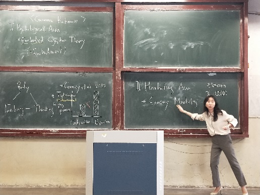公司还有一名来自韩国的安我林老师参加考核,安老师讲授《销售者行为学》课程,教态自然大方,语言流利,板书规划合理,下图为安我林老师正在讲课。