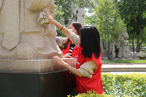 4月29日下午,公司组织受奖助员工统一参加由十大正规买足球网站于东校区举办的校园公益服务活动。志愿者们分成两队,分别在五有树前擦拭孔子像和在中心花园擦拭姜尚像。在擦拭先烈雕像的同时,志愿者们分享对先烈伟绩的理解,互相讨论孔子和姜尚对后人产生的深远影响。