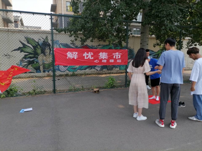 活动伊始,心晴驿站部分成员通过QQ编写说说,并通过线上、线下宣传等方式进行宣传,加大活动的宣传力度。随后,心晴驿站成员组织参加活动的同学们自由组队,填写活动报名表。经过统计,录取报名的前八组同学。解忧集市为由五人进行自由组队的团队游戏比赛。首先,活动全程在操场参赛入口处设“解忧信箱”与“车马慢”环节,参赛同学可将自己的心事与心里话写在带有编号的信纸上,并留下自己的联系方式,由此次活动解忧人进行解忧与合理回复或由小信使代为传递,以信件为媒介,将美好祝愿汇于笔尖。其次,解忧集市内部分为五个小铺,分别为五个小游戏,由五人小队自由分配人员完成。评委对每位参赛人员在每个参赛项目的完成情况进行赋分。最后工作人员统计所有参加活动的同学,对符合条件的同学进行二课学分的发放。