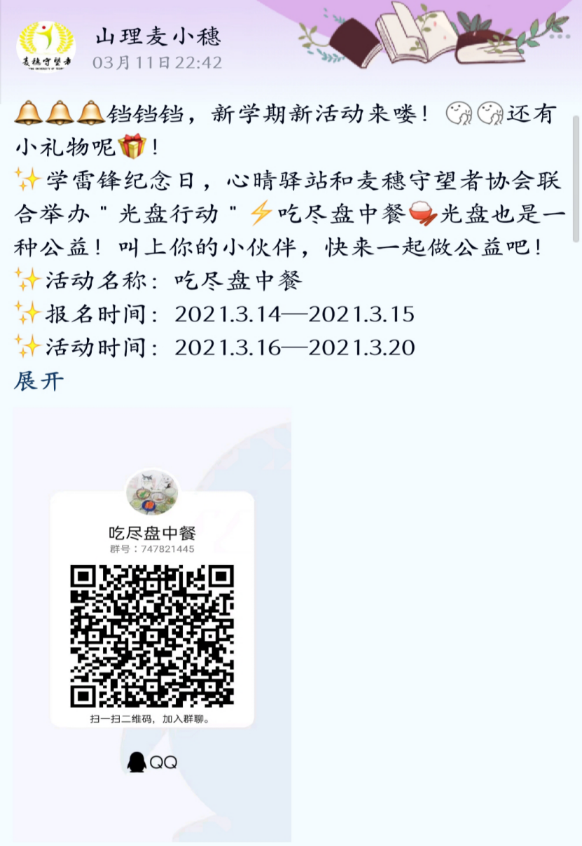 值此第五十八个“学雷锋”纪念日与第二十二个“中国青年志愿服务日”,弘扬雷锋精神,展现当代老员工的责任势在必行。光盘也是一种公益,节俭节约亦是重要的雷锋精神。因此,麦穗守望者与心晴驿站协会于3月12日至3月15日在东校区餐厅门口举行“吃尽盘中餐”宣传活动。作为当代老员工,我们必须深入地了解、关注食品浪费现象,从细微处着手弘扬雷锋精神。