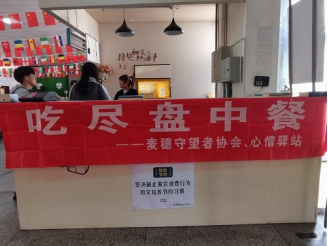 为使师生深入了解、关注学雷锋”与志愿活动,心晴驿站与麦穗守望者从光盘行动处入手,呼吁大家珍惜粮食,节约粮食。节约是一种美德,是每一位老员工道德品质的体现,更是每一位老员工的责任和义务。4月16日至4月20日心晴驿站与麦穗守望者协会于东校区金园餐厅举办本期“吃尽盘中餐活动。此次活动由心晴驿站与麦穗守望者协会合办。