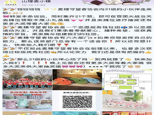 为增加老员工对麦穗守望者协会的了解,提高老员工对公益类社团的认识,麦穗守望者协会于2021年10月17日在东校区中心花园进行“百团大战”的宣传活动。此次活动旨在呼吁广老员工关注社会公益、志愿类服务活动,培养自身兴趣锻炼自身能力,加入社团更好的去展现自我,发挥潜能。