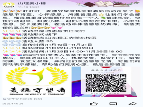 为了令员工更加关注身边默默奉献的劳动群体,以感恩之心对待劳动群体,以实际行动表达感激之情,以青春年华勇担社会责任。麦穗守望者协会于11月25日14:00-11月26日18:00开展“感恩与责任同行”活动。此次活动旨在让同学们学会感恩我们身边的事物,用感恩之心对待他人,同时也向身边人物送出温暖。