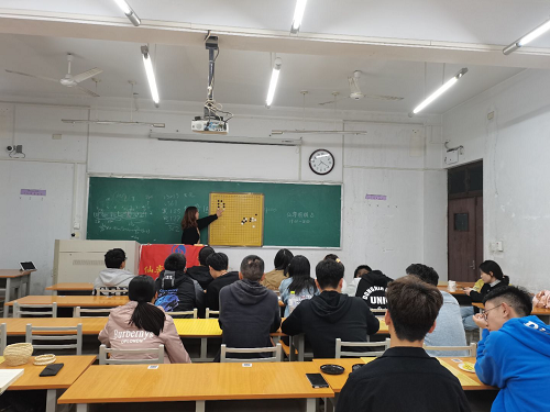 活动之初,由会长李洋主持开场并介绍了这次培训的主讲人——王艺儒。首先王艺儒为小萌新们讲解了围棋棋盘的制式、拿棋子的手法和围棋中的礼仪和规则;然后,王艺儒为大家介绍了围棋中的“气”,“一口气死,两口气活”,一个单独的棋,四周有四口气,围棋的气越多就越不容易被吃掉而气越少越易被吃,当四周被方占据后,中间的棋就会被吃,所以下棋时应尽量保证自己的棋子不被围住。在讲完“气”后,王艺儒又为大家讲了围棋的提、断等,为了加深学员对围棋的了解,王艺儒现场出了几道“活死题”,在此其问学员们与培训员积极互动,学员们学习的热情非常高涨。