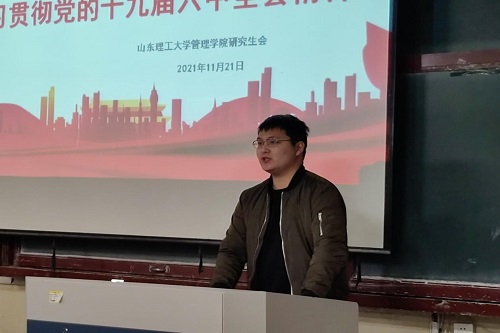 首先,油建盛同学带领大家深入了解了党的十九届六中全会精神并阐述了对全会精神的理解。一百年来,我们党团结带领人民进行伟大奋斗,书写了中华民族几千年历史上最恢宏的史诗,积累了十分宝贵的历史经验。作为一名新时代的研究生,要努力夯实专业基础,潜心钻研研究课题,深刻领悟先进思想,勇于担当时代赋予的使命,以新思想、新风貌,新行为、新作风行走在新时代的征程上,为实现中华民族伟大复兴的中国梦添砖加瓦。