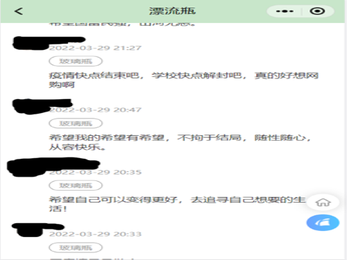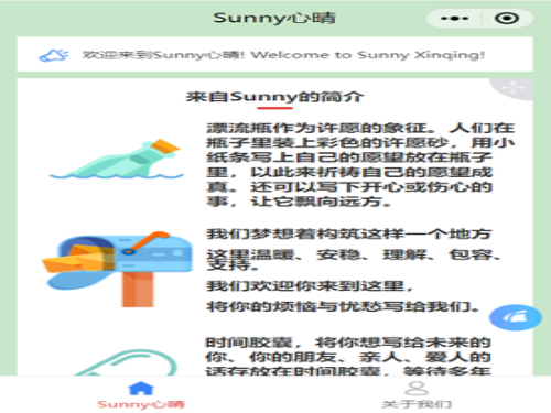 活动伊始,心晴驿站成员通过QQ编写说说转发,线上宣传的方式进行宣传,提高活动的宣传力度。随后,同学们通过到梦空间进行线上报名,并加入活动QQ群扫码进入微信小程序。本活动限报260人,经统计,共有240人报名参与此次活动。此次活动使用的微信小程序“Sunny心晴”共分为三个板块,分别为“漂流瓶”、“解忧信箱”、“时间胶囊”。参与活动人员可选择任意板块,将自己的希冀、烦恼倾诉,工作人员对需回信的用户进行答复,向用户提出一些中肯善意的建议。以网络为媒介,以文字为载体,祈祷心想事成,愿望成真,美好如期而至;让忧愁困苦随风而散,飘向远方。以此方式营造一个温暖的港湾,增进同学们的心理健康。活动最后,完成微信小程序版块项目的同学,截图留存自己书写内容,凭此截图找活动工作人员领取签到码。活动结束后,工作人员统计所有参加活动的同学,对符合条件者给予二课学分的发放。