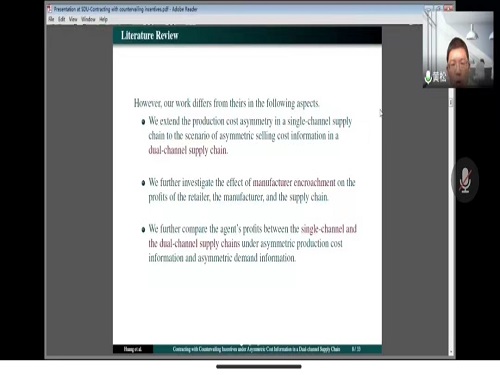 本次报告会黄松教授和大家分享了自己的学术论文“Contracting with countervailing incentives under asymmetric cost information in a dual-channel supply chain”,主要从文章的背景、综述、模型和假设以及研究结论展开介绍。