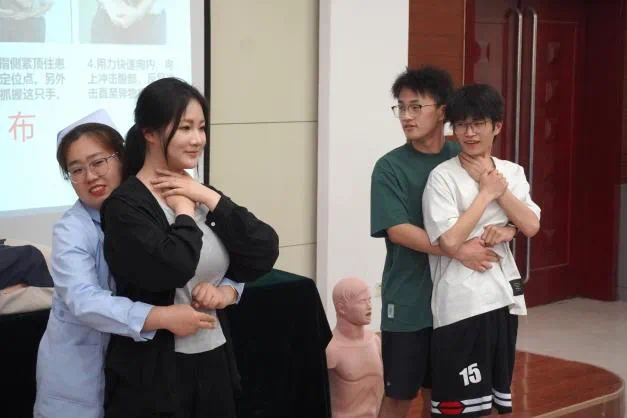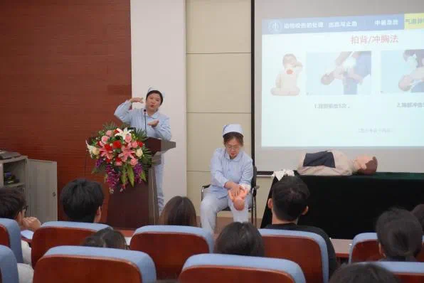 门延艳副教授从动物咬伤的处理、出血与止血、中暑急救、气道异物梗组急救、心脏复苏等五个方面对急救知识与技巧进行了生动讲授。随后,现场参与员工踊跃互动、认真实践,将课程所学积极转化为自身的基本技能,感悟体会并传播护理温暖。