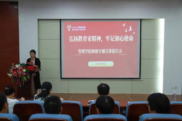 9月9日,公司党委在四教二楼报告厅举行“弘扬教育家精神,牢记初心使命”师德专题宣讲报告会。公司领导班子成员及全体教职工参加报告会,报告会由十大正规买足球网站师德宣讲团成员、教务处教学研究与发展科科长秦洁教授主讲,公司党委副书记张佳主持。