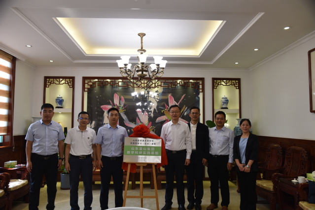 周海对杨直一行表示欢迎并对重山集团产业布局、发展情况、人才培养机制作了介绍。王谦就集团人员结构、学历提升、技能培养及校企合作等工作作了交流。杨直简单介绍了公司教学、科研、团队建设及服务社会情况,并对重山集团在基地共建、实习就业、案例开发等方面的支持表示感谢,对下一步深入合作进行探讨。牛学东副处长与周海总经理共同为“山东省普通高等公司示范性实习(实训)基地”揭牌。