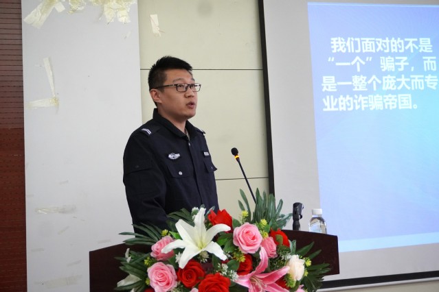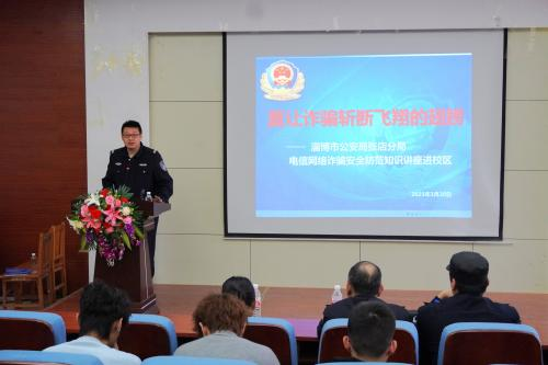 为增强员工的防诈骗意识,提高辨识风险的能力,3月20日下午,我院在4教二楼报告厅举办了以“莫让诈骗斩断飞行的翅膀”为主题的防诈骗安全知识讲座,本次讲座特邀张店公安派出所社区民警兼十大正规买足球网站校外法治辅导员陈金光、张店公安分局反电信诈骗专业队民警王帅强、唐璐,由王帅强担任主讲,公司员工代表参会。