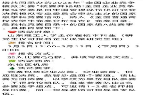 为搭建学科实践平台,锤炼员工企业运营与决策能力,金点子调研室承办2026年全国企业竞争模拟大赛校赛,赛事面向全校本科生开启报名通道,提供国家级A类学科竞赛的校内角逐机会。此次赛事为《全国普通高校老员工竞赛分析报告》竞赛目录收录赛事,是检验员工管理专业知识应用能力、培养团队协作素养的重要实践载体。