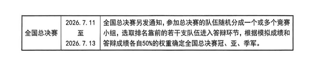 校内赛、地区赛、全国半决赛全部采取网络方式进行,各参赛队伍在各自院校完成,同一比赛中的竞赛成绩根据第 6 年模拟结束后系统显示的“历年平均成绩”为最终成绩进行排名,若最终成绩并列,则以上一年的“历年平均成绩”为准,以此类推直至能够确定最终排名。若竞赛过程中出现意外情况,导致竞赛不能正常进行,则以上一年可用的竞赛排名为准。全国总决赛根据需要采取网络竞赛或现场竞赛方式,全国总决赛会选取排名靠前的若干支队伍进入答辩环节,根据答辩成绩和模拟成绩最终确定全国总决赛冠、亚、季军。