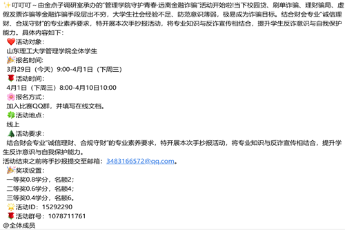 此次“守护青春・远离金融诈骗”活动以个人参与的形式开展。在活动结束后,金点子调研室社团也对提交的每一份作品都进行了严格的审查,杜绝弄虚作假行为,同时对积极参与本次活动的同学给予了一等奖0.8二课分;二等奖0.6二课分;三等奖0.4二课分的奖励。